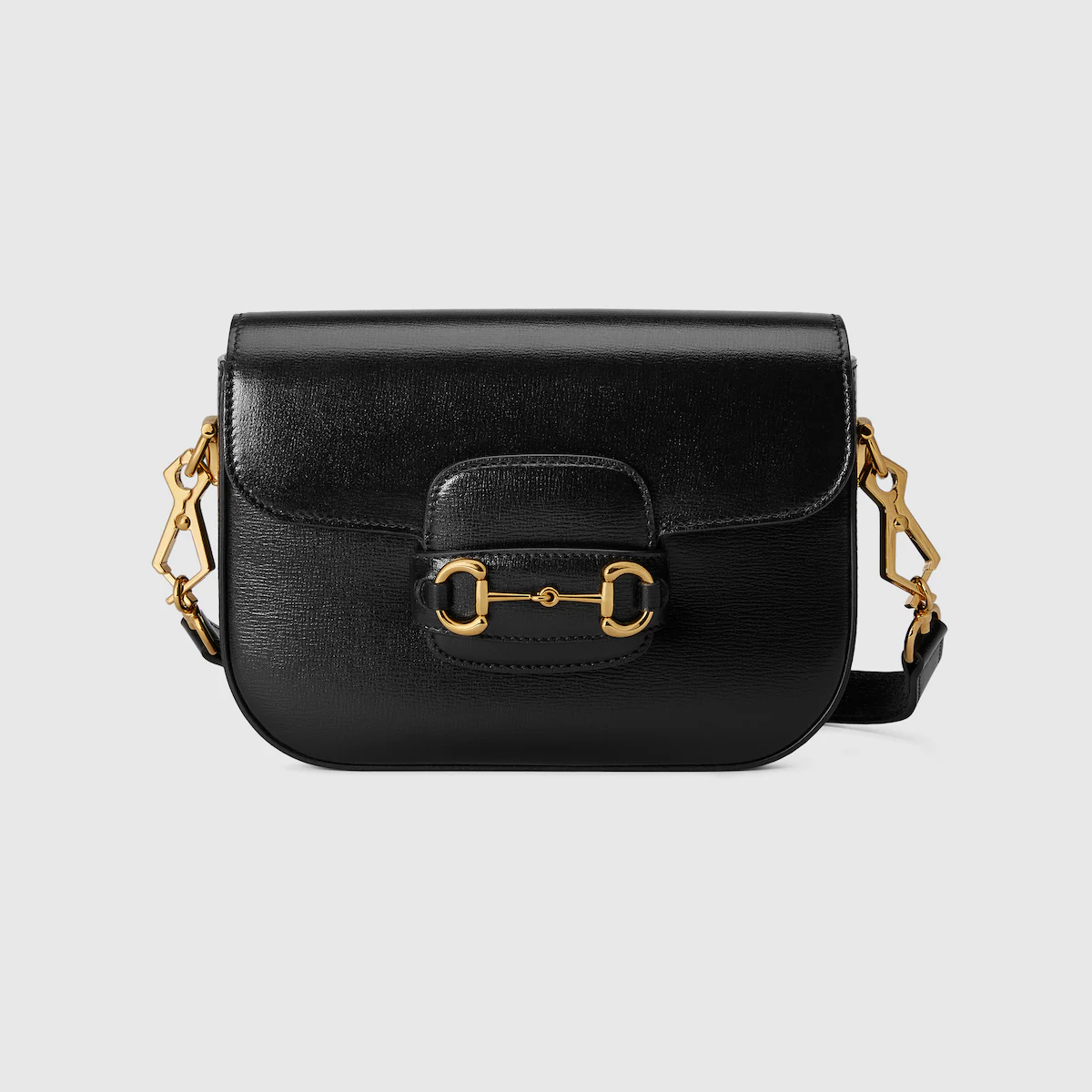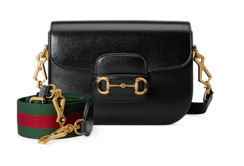 Petite versions of the Gucci Horsebit 1955 add a hybrid twist to the vintage inspired line. Enriched with two different shoulder straps. the black leather mini bag’s character transforms from understated elegance with a tonal leather strap to a strong logo feel thanks to a red and green Web option.