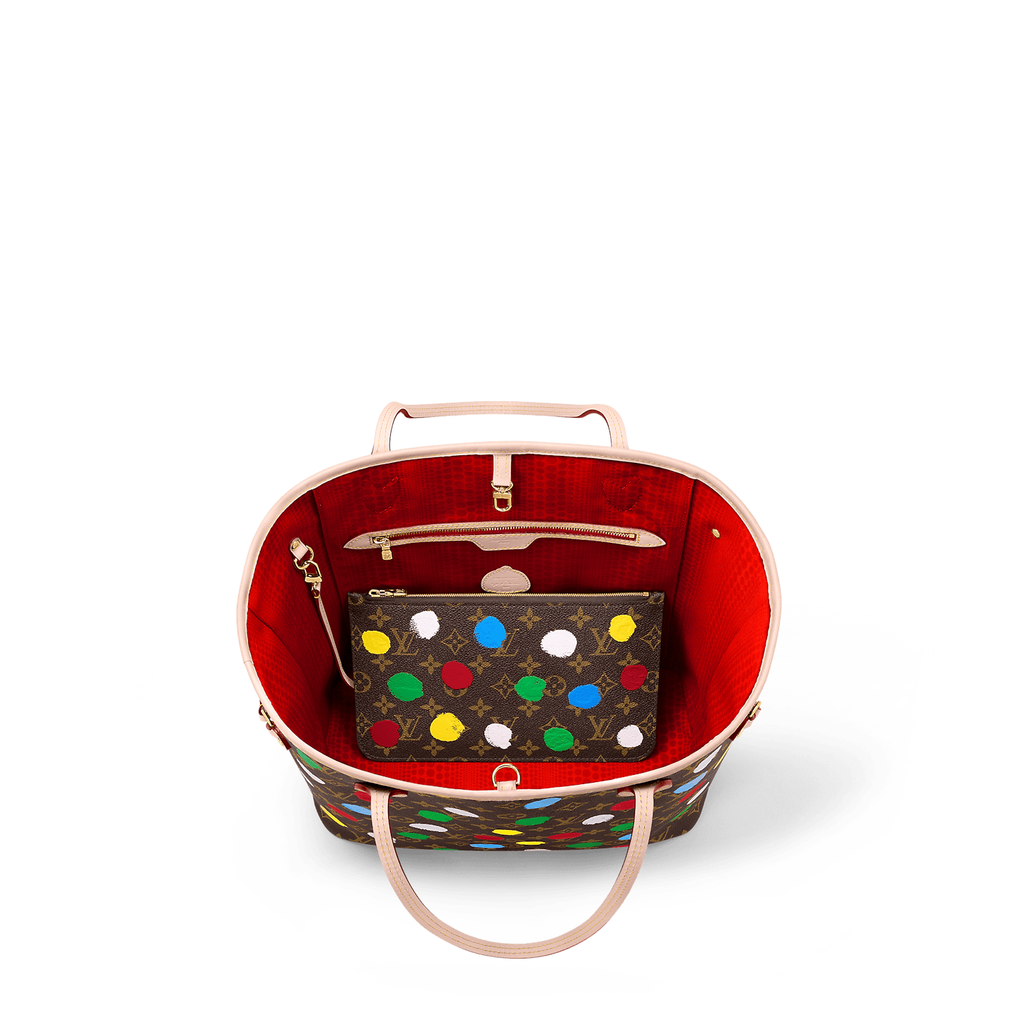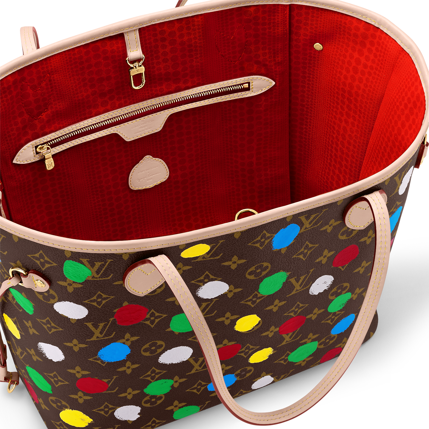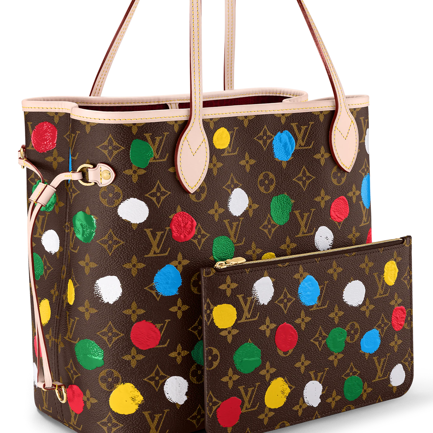 The spacious and elegant LVxYK Neverfull MM tote joins the Painted Dots theme as part of the new Louis Vuitton x Yayoi Kusama collaboration. Monogram canvas is decorated with the renowned Japanese artist’s signature dots. a unifying element in her work. A complex screen-printing process gives the colorful dotted pattern a 3D relief effect. adding a burst of vibrant energy to a practical carryall.