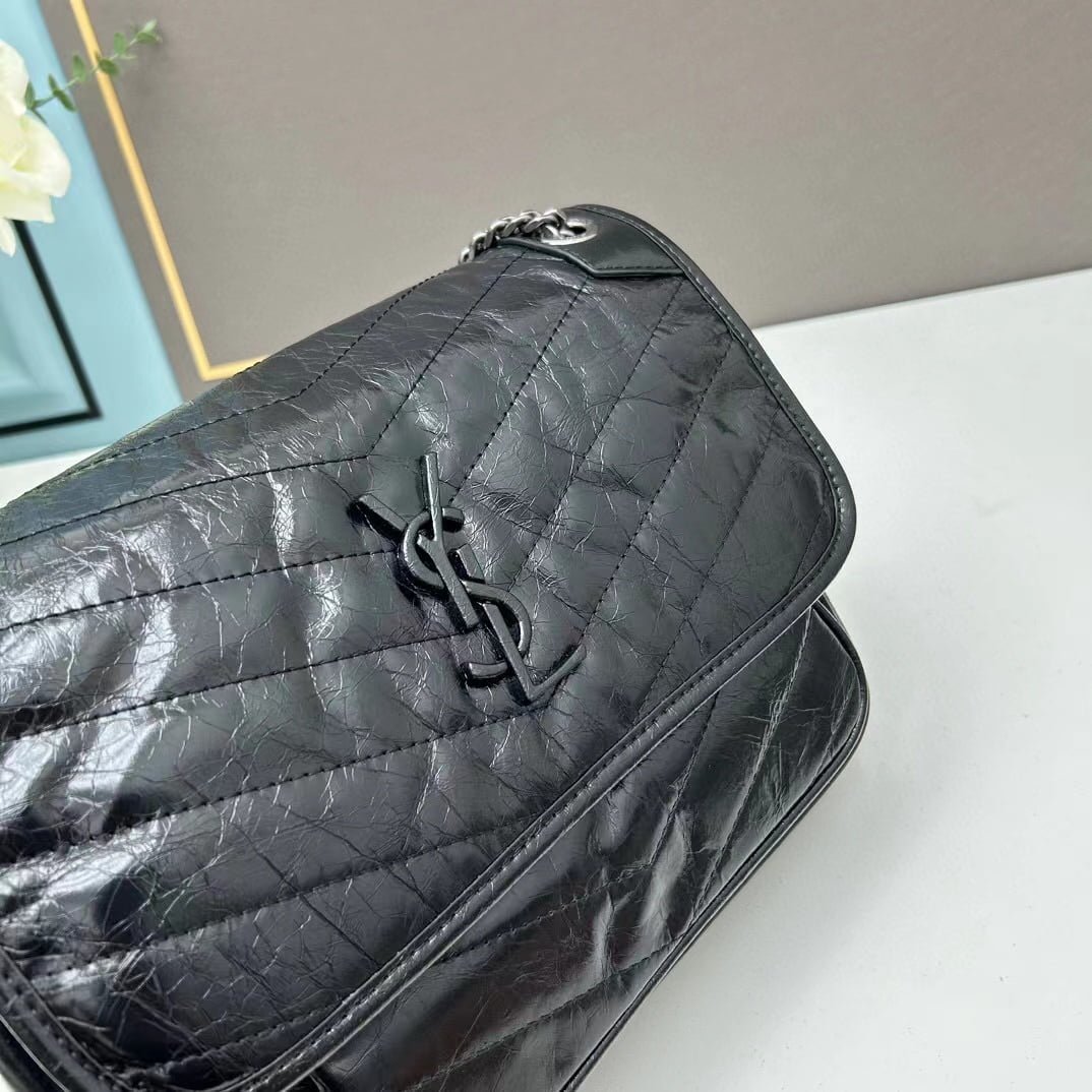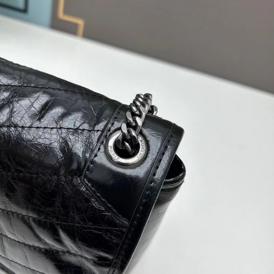 LAURENT front clamshell bag with real leather-covered YSL trim, chain and leather multi-purpose shoulder strap, center compartment and open back pocket. Size 28CM imported leather dual-purpose chain shoulder strap 1 center compartment, 1 inner bag, 1 zipper pocket, 1 open progen, 1 flip bottom pocket