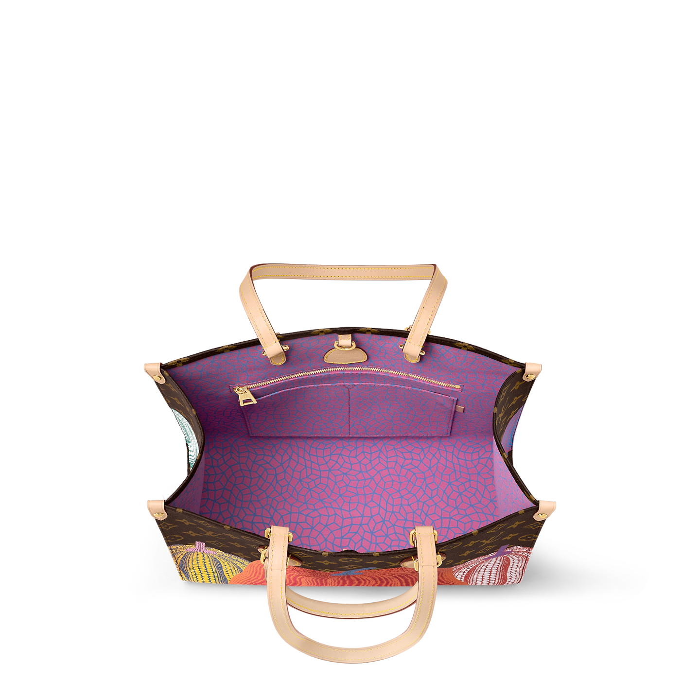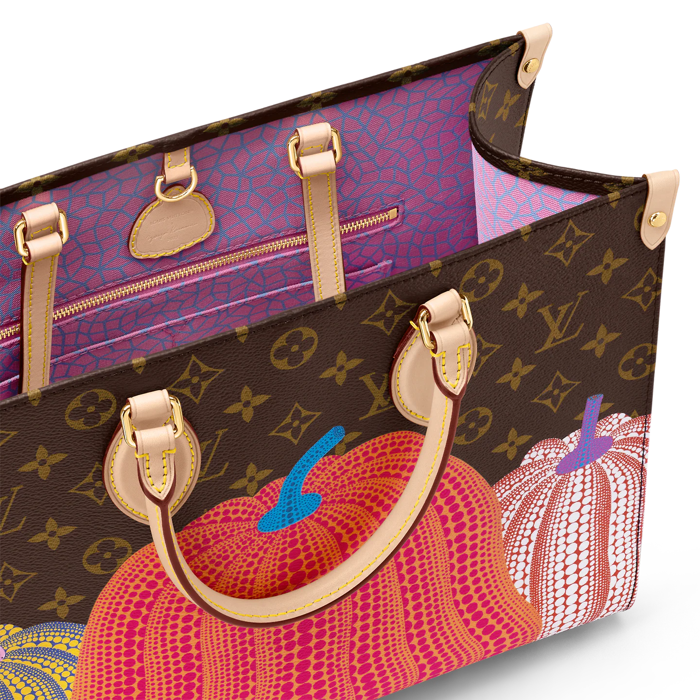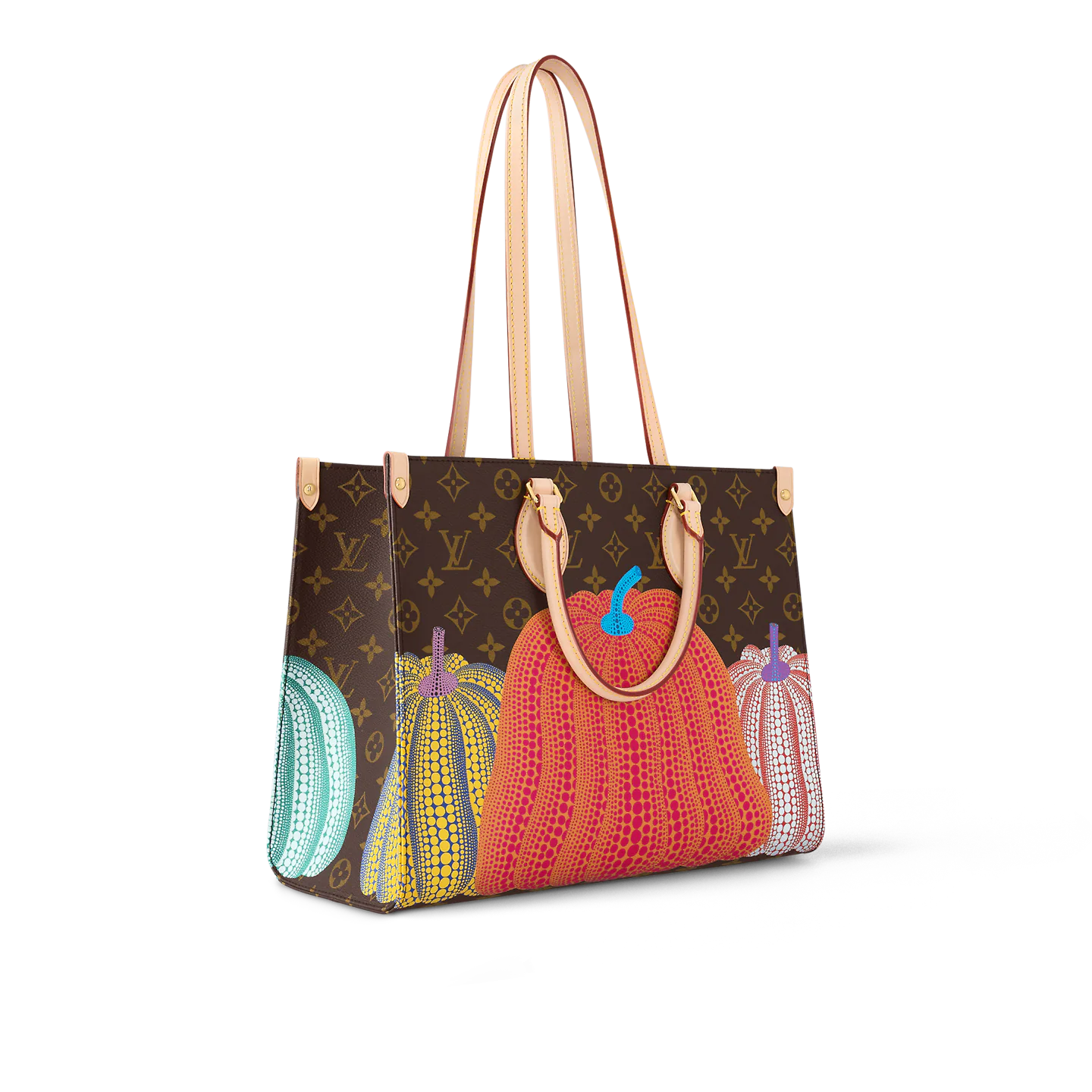 Featured in the exceptional new Louis Vuitton x Yayoi Kusama collection. this version of the LVxYK OnTheGo MM was inspired by a key theme in the celebrated Japanese artist’s work: pumpkins. a symbol of comforting warmth. Monogram canvas is printed with a row of stylized pumpkins in cheerful colors. punctuated with Kusama’s signature dots. A handy. capacious bag that’s sure to become a collector’s piece.